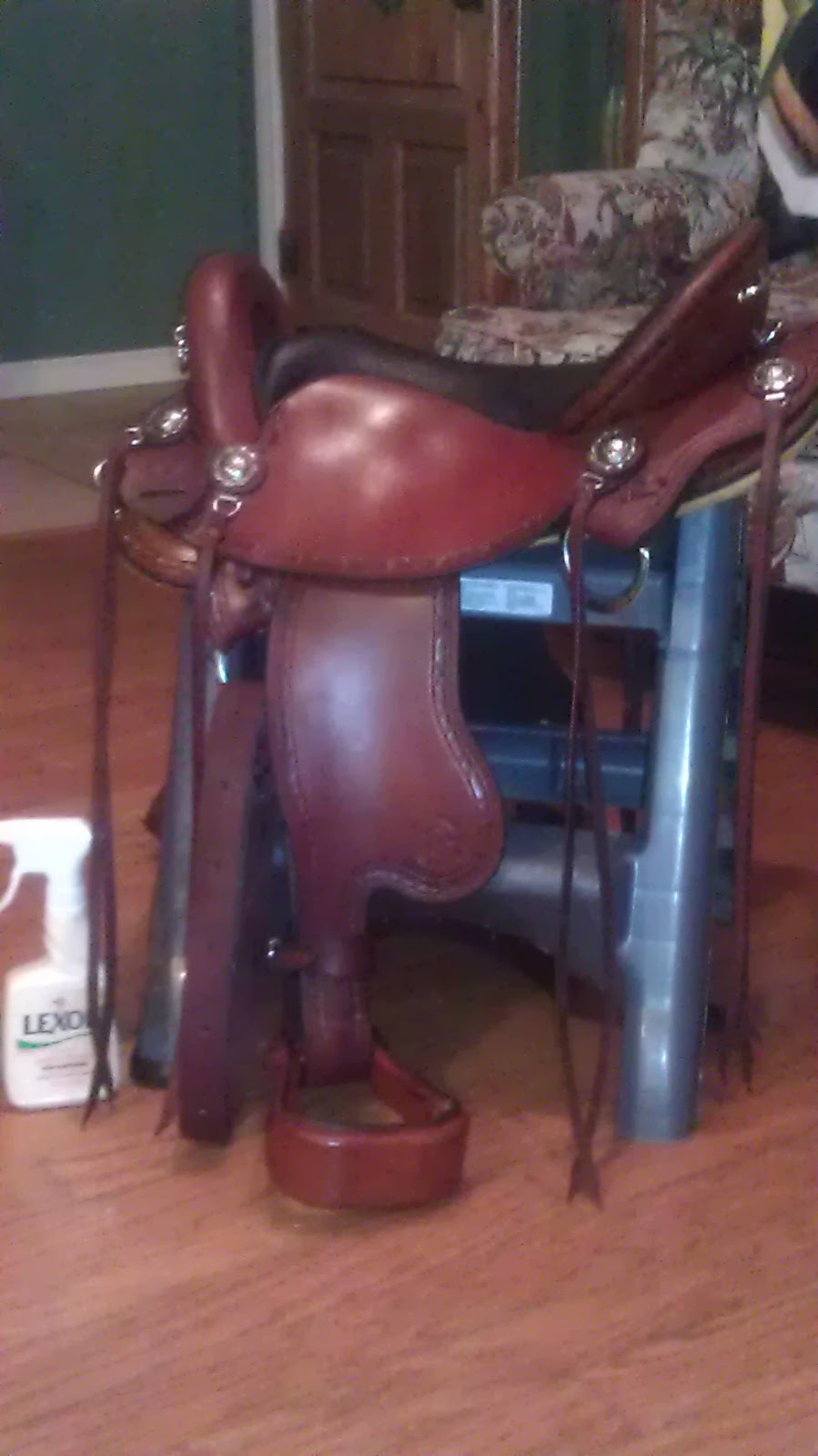 I came home and took my saddle out of the Brenderup after removing the hairy girth. I got my stepping stool and a rag and got after it. I sprayed the saddle in sections and rubbed the conditioner in. I moved the stirrups and oiled the ties and the girth straps. My saddle is clean as it can be and the straps and tie strings are soft!